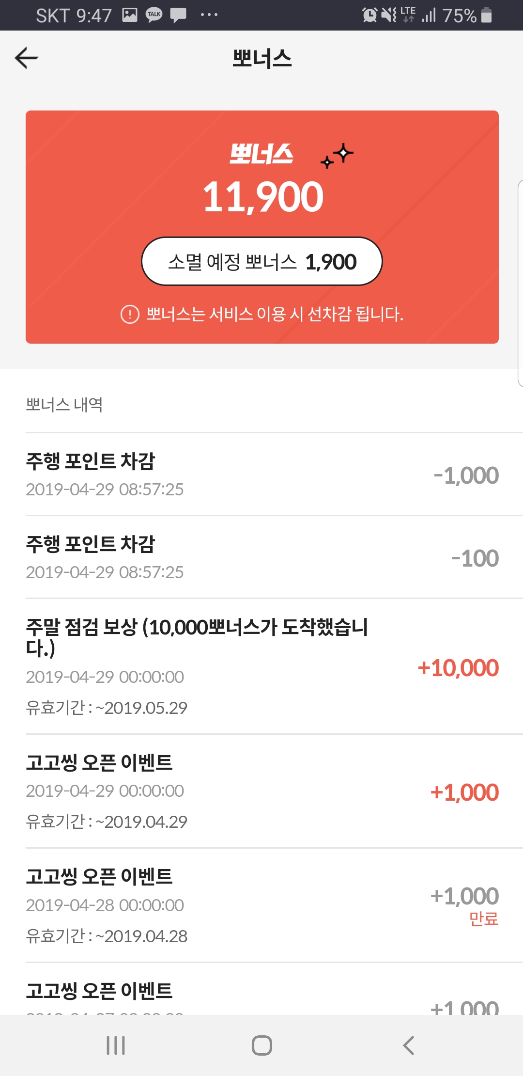 - 서비스 초기라 그런지 뽀나스 쿠폰을 마구 뿌려주고 있습니다. 2019.04.29 기준 회원 가입 시와 운전면허 등록 시 각각 3000포인트, 주말에 긴급 점검했다고 10000포인트를 선물해줬습니다. 또한 매일 1000포인트를 제공하고 있습니다. 킥고잉에서도 자극을 받았는지 다음 달 중순까지 매일 1000포인트를 제공해줄 예정이라 출퇴근 시에 각각 이용해서 비교해보시는 것도 좋을 것 같습니다.