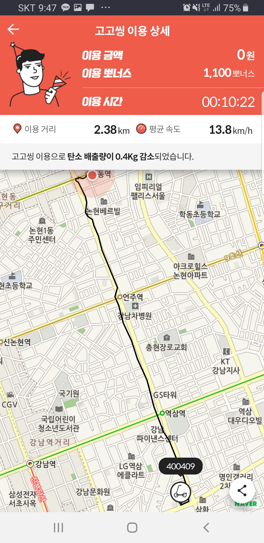 - 운행 종료 시 주행 거리와 환경적인 요소인 탄소 배출량 감소를 보여주는 것이 신선했습니다.